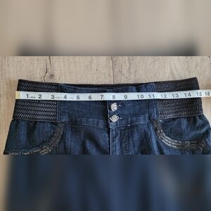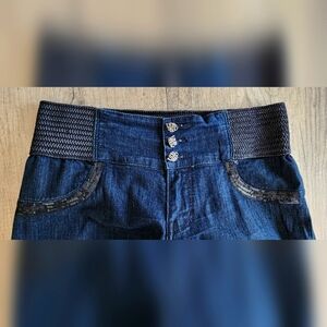 Uncensored Jeans Women's size 30, Colombian butt lifting dark blue skinny jeans with wide waist band, logo buttons, and sequined mock pockets. They have a small zipper that have one twisted tooth but opens and closes as it should, as shown in photos. Other than that, the jeans have no stains, no rips, no pilling, and no missing buttons. Cotton and spandex fabric. SKU0524