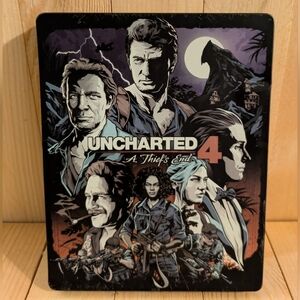 Uncharted 4 A Thief's End metal poster featuring iconic characters. Perfect for fans and collectors. Vibrant artwork with a mix of colors.