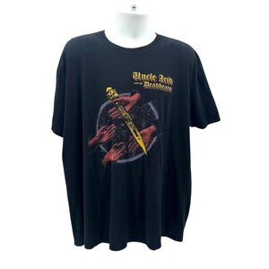 ****Size tag is missing, fits like a Men's Size 2XL, see below for measurements*** Short sleeve black crew neck t-shirt with red, purple & yellow graphics - Uncle Acid And The Deadbeats spelled out with hands & a dagger / knife.