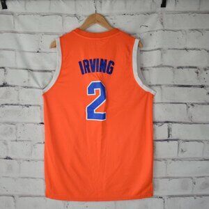 Inspired by 2018 Film “Uncle Drew” Harlem Buckets Kyrie Irving 2 Basketball Jersey movie promo merchandise. Sportswear jersey features Harlem Buckets sewn on one piece heat press across chest with Irving applique on nameplate at back with number. Super soft performance polyester jersey Split, drop hem. No rips or holes. Number on back has some creases.