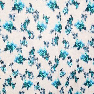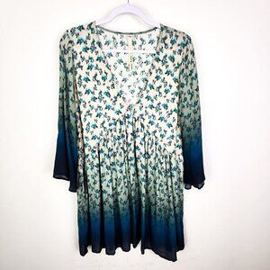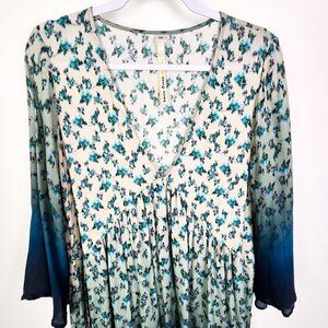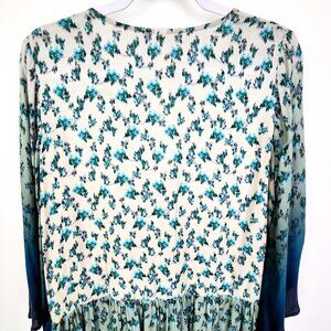 - Description: Blue and cream toned floral gradient dye flowy dress; flared sleeves; deep v-neck; pockets