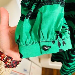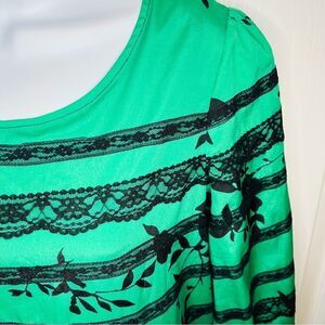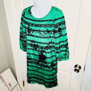 Uncle Frank Satin Floral Shift Dress Stripe Lace Trim Green Black Size Small. 3/4 sleeve. Stripe lace trim. Shift silhouette. Keyhole back. Lined. Fabric does not have stretch. Mini length. Satin fabric. Gently used good preowned condition. No holes or stains. Just slight signs of use.