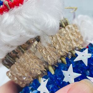 What a fun unique piece. Almost looks like Santa Claus in an Uncle Sam costume. Hand crafted beaded decorative display that has an added lightbulb for display. Unique and one of a kind! See all images for more info and details. Bin 75