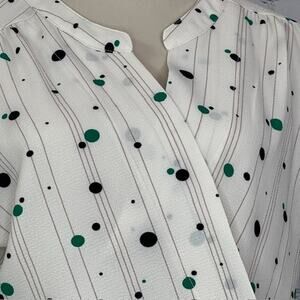 This flattering Cream top blouse is gently used and is in good condition. Colors are green and black circles and tan stripes.