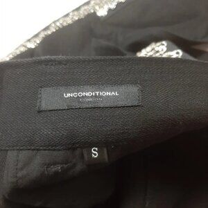 The Unconditional London Denim Adorned Safety Pin Stripes Jeans are a stylish and unique addition to any man's wardrobe. Made in the United Kingdom, these 31" jeans feature a button closure, mid rise, and 30-inch inseam. The dark wash denim is accented with safety pins and embroidered logos, giving them a hipster, retro vibe. With a comfortable fit and breathable fabric, these jeans are perfect for all seasons and can be dressed up or down for any occasion.