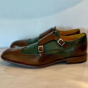 Handcrafted in Portugal from premium leather, these shoes feature a bold tri-color combo of chestnut brown, forest green, and burnished toe broguing, finished with a dual monk buckle and full leather sole.