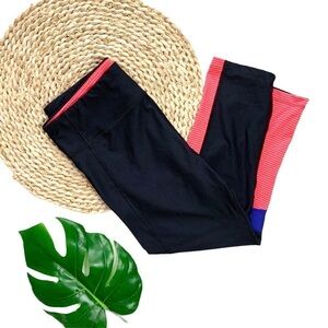 These Under Armor Capris are that classic black legging we all love with a bold vibrant touch of coral and a purple/blue shade to elevate your look!