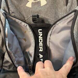 Under Armour Storm Contender Backpack in graphite and black. This durable backpack is designed to withstand the elements with UA Storm technology, making it water-resistant. It features multiple compartments, including a soft-lined laptop sleeve and various organizational pockets, making it ideal for school, work, or the gym. The padded shoulder straps and back panel ensure comfortable carrying, even with heavy loads. The main front pocket has some minor staining inside as shown in the pictures. Otherwise in great used condition. Lots of storage.