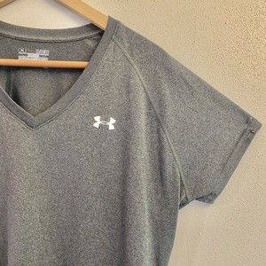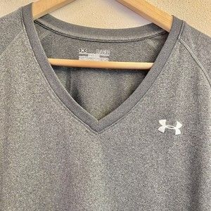 Under Armor Womens Size XL Semi-Fitted Heat Gear V-Neck T-Shirt Gray. Excellent Preowned ConditionMeasurementsSleeve - 12"Armpit to Armpit - 22"Length - 25"M-17