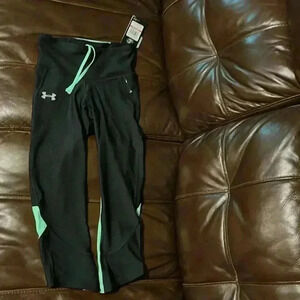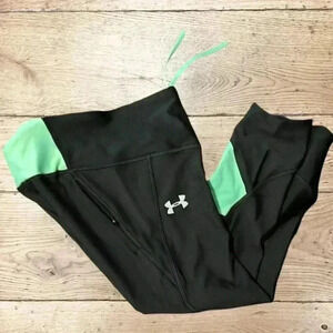 These leggings are black with green accents They are new with tags, have a hidden pocket and the heat gear fabric is designed to keep sweat away from your skin.