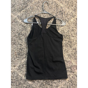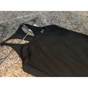The image displays a black women's racerback tank top, possibly from the brand Under Armour