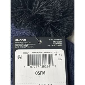 The Under Armour Adult OSFM Navy Knit Cuff Beanie with Pom is a stylish and cozy accessory for men during the winter season. Made with a blend of polyester and acrylic, this beanie features a logo design on the cuff and a pom pom detail for added flair. The knit fabric ensures a comfortable fit, while the blue color adds a pop of color to your winter wardrobe. Perfect for keeping warm and looking good in cold weather, this beanie is a must-have for any outdoor enthusiast. New with tags.
