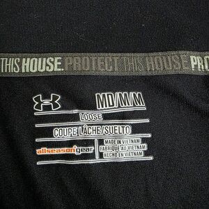 Under Armour men’s medium pullover. Black lightweight 1/4 zip AllSeasonGear with white logo and loose fit. 100% polyester, made in Vietnam. Ideal for training or casual wear.