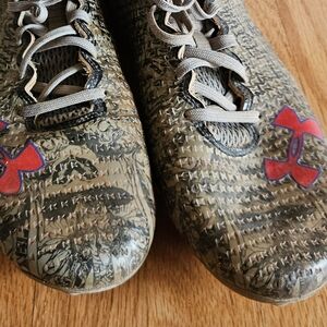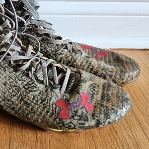 Overall good pre-owned condition. Under Armour logo is just starting to peel off on toe of right shoe. Cleats show some surface wear