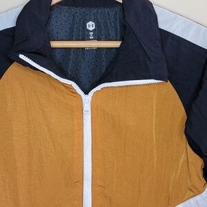 Retro old school style mustard golden tan, black, white colorblock zip front jacket with zippered side pockets.