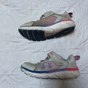 Under Armour Assert 9 athletic sneakers. Running tennis shoes in gray with blue / pink / purple ombre with hook and loop Velcro closure. Play condition for overall wear and dirt on mesh. Size 11.