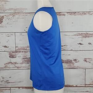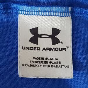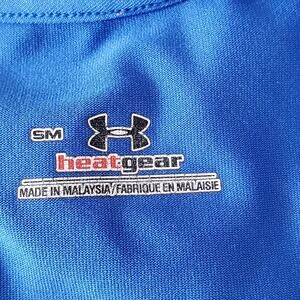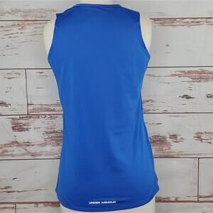 Under Armour heat gear sleeveless athletic tank top. Blue with graphic on the side and chest. A couple of snags as pictured, otherwise good preowned condition. Size S.