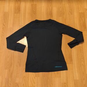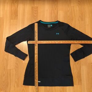 The Under Armour Base 2.0 Shirt Top for women in size medium is a black, fitted thermal shirt designed for outdoor activities like cross-training, hiking, and running. Made of a blended fabric of polyester and elastodiene, this pullover shirt features a crew neck, long sleeves, and a solid pattern.