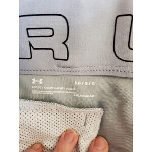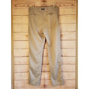 Under Armour Baseball Pants Large Mens Gray with Black stripe Loose Fit Size L. Excellent used condition, very faint marks on knee areas, close up photos provided. Measurements are approximate waist is 34 inches, inseam is 32 inches, total length is 41.5 inches long. Smoke free home.