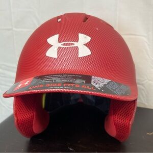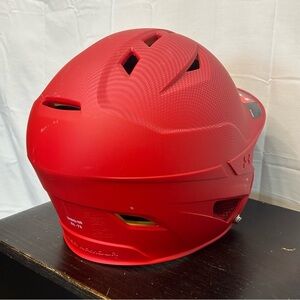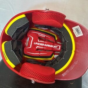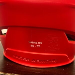 Vibrant scarlet helmet with Under Armour branding. Sleek and protective design.