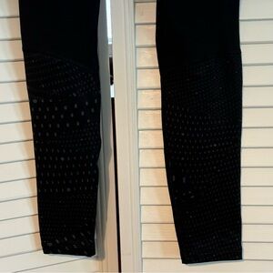 Description: Classic black athletic leggings with a speckle pattern in the legs. No size tag, see measurements: