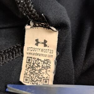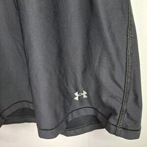 Under Armour fitted black tank top, racerback style, Style 1253672. Lightweight and stretchy fabric designed for activewear. Small silver Under Armour logo at hem.