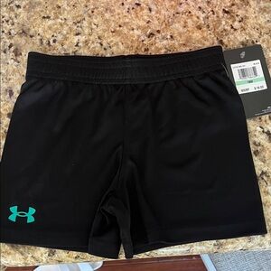 Sleek black shorts with a vibrant green Under Armour logo. Ideal for active wear.