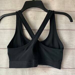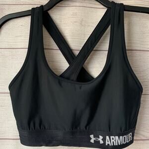 Black sports bra with mid cross back by Under Armour. This pull over sports bra has the white Under Armour logo and words on the front left side of the bottom band. The back straps criss cross and create a keyhole. It has an elastic bottom band. It has holes for removeable pads but is missing the pads.