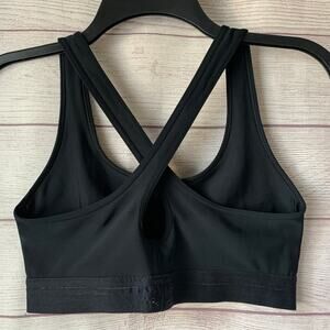 Black sports bra with mid cross back by Under Armour. This pull over sports bra has the white Under Armour logo and words on the front left side of the bottom band. The back straps criss cross and create a keyhole. It has an elastic bottom band. It has holes for removeable pads but is missing the pads.