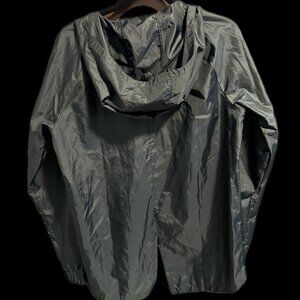 The Under Armour Black Windbreaker Jacket is a stylish and functional activewear piece designed for women in size Medium. Made with durable nylon and polyester material, this loose-fitting jacket features a zip closure and a sleek black color. Perfect for outdoor activities or casual wear, this windbreaker combines comfort and style, making it a versatile addition to any wardrobe. The back is longer at the bottom, sort of like a penguin cut.