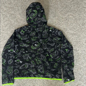 This raincoat from Under Armour offers a sleek black design with striking green accents, perfect for rainy days. Made from durable synthetic materials, it features an integrated hood for optimal weather protection. Stay dry and stylish with this essential raincoat.