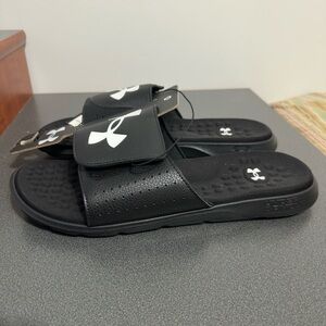 The Under Armour Men's Ignite Pro Slides in Black/Black/White are a stylish and comfortable choice for active men. With a sleek black design and adjustable synthetic strap, these sandals provide a custom fit and added comfort. The soft foam lining ensures that your feet are cushioned during long hours of wear, making them ideal for athletic activities or casual outings. The Under Armour brand guarantees quality and performance, making these slides a reliable choice for any man's shoe collection.
