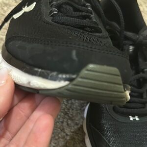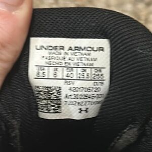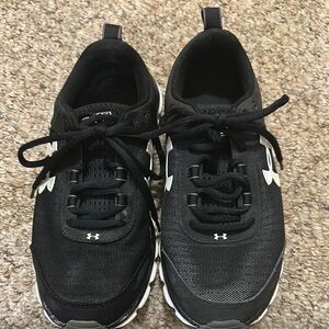 Stylish Under Armour sneakers. Sleek black design with white accents. Comfortable and durable.