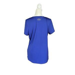 Under Armour Blue V-Neck Gray Camo Logo Active Athletic Short Sleeve Top