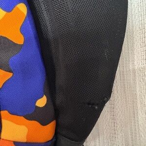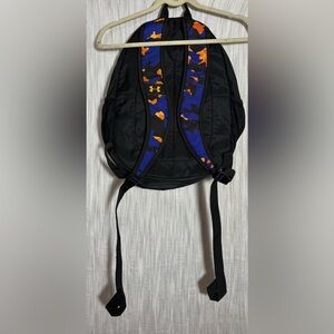This Under Armour backpack showcases a vibrant blend of blue and orange, highlighted by a unique geometric pattern. Its sporty and contemporary design makes it a standout choice for those seeking both style and functionality in their everyday carry. There is a small tear but does not affect functionality see in second photo