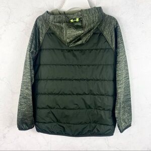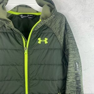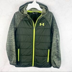 Under Armour Boys Day Trekker Hybrid Jacket. Long Sleeves. Hooded. Zipper Closure. Hand Pockets w/ Zipper Closure. Contrasting Sleeves. Water & Wind Resistant. Cute & Comfy. No Stains or Rips.