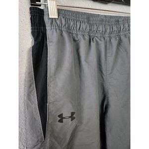 Under Armour Boy's Gray and Black Track pants. 2 Pockets. Drawstring Waist. Fully Lined. 100% Polyester. Athletic. Sports. Gym. Training. Size YXL. Excellent Used Condition.