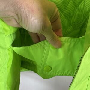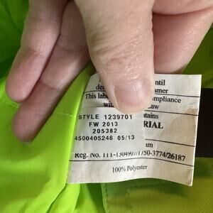 Good preowned condition. Small light spots of discoloration to the front of the jacket. Light area of red color to interior of hood. Shoulder logo without original green color. See photos.