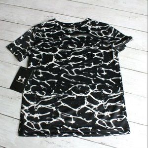 This short sleeve performance shirt is black and white with lime green Under Armour logo. It is brand new with tags.
