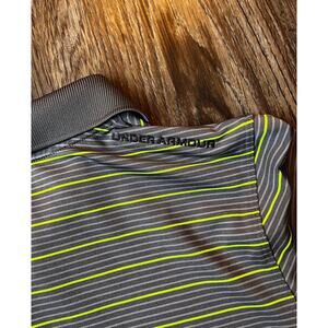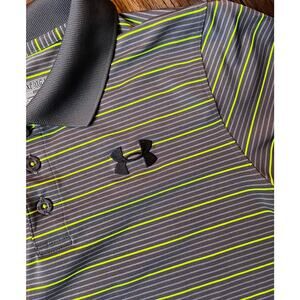 Under Armmour boy’s size XL 18/20 loose fit heatgear grey and yellow striped polo shirt. In excellent condition from a smoke free home.