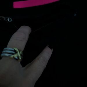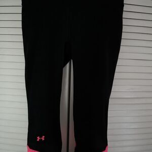 Under Armour cropped athletic leggings in black with bold pink accents, including textured pink hems, pink mesh slits on the knees, and a pink breast cancer awareness ribbon on the back (not at pictured in the stock pic. it's not in the front it's on the back). Features a small zip pocket at the back waistband for keys or essentials. Labeled a Small Petite. Great for running, walking, gym sessions, or breast cancer awareness events. There is some wear on the left knee in the pink section—please see photos.