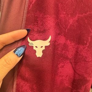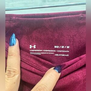 Stylish Burgundy leggings by Under Armour. Comfortable fit. Perfect for workouts. Mini pocket on the backside. Part of the Bull logo is peeled off.