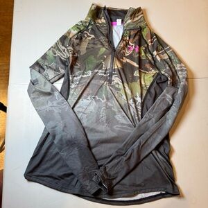 Camo jacket with quarter zip closure. Features green, brown, and pink.