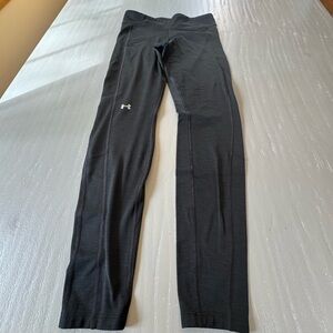 Sleek charcoal leggings by Under Armour. Ideal for active wear. Cold weather gear: lined with a light fleece for the chilly outdoors! Full length legging.