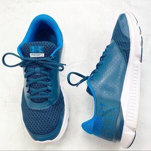 Under Armour Blue Speedswift 2 Tennis Shoes. Lace Closure. Tongue Pull. Mesh & Leather Upper. Rubber Outsole. Lightweight & Breathable. Super Cute & Comfy. No Stains or Rips. Great Condition! Minor Scuffs.
