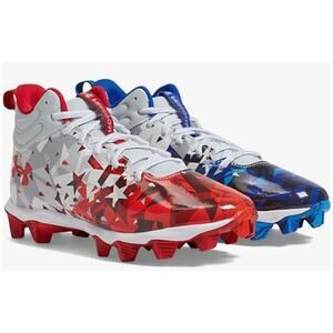 The Under Armour Freedom Cleat Shoes in blue and red are designed for boys in size 11. These cleats feature an abstract design and lace-up closure, offering a secure fit and bold style, perfect for active play and sports.