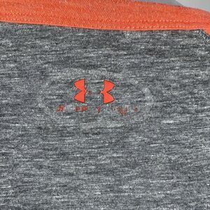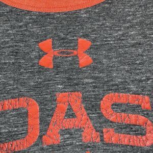This is a gray Under Armour Coast Guard Distressed Shirt with a crew neck and 3/4 sleeves. Made of cotton jersey fabric, it features a logo graphic print and is lightweight and breathable. Ideal for summer, fall, and spring, this athletic fit tee is suitable for sports and gym activities, with a patriotic Coast Guard theme. It is machine washable and tagless for comfort.