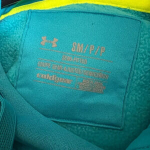 Under Armour cold gear hooded sweatshirt with drawstring and front pockets. Blue with neon green accent