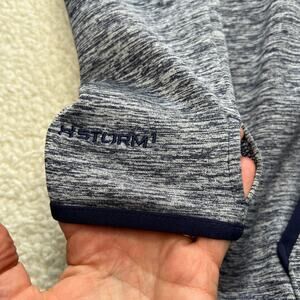 Under Armour Cold Gear Loose Fit Navy Heathered Hoodie Medium. Preowned and in excellent condition. Hoodie has kangaroo pocket on front, soft feel, and thumb holes on sleeves. Please see all photos. Approx measurements in pictures.