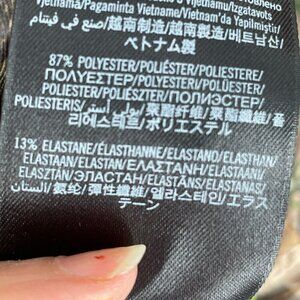 All over print in a camo with leaves, branches and other woodsy elements so you blend in. Pink top stitching and logo on high neck collar and at hem. Polyester/elastane blend.